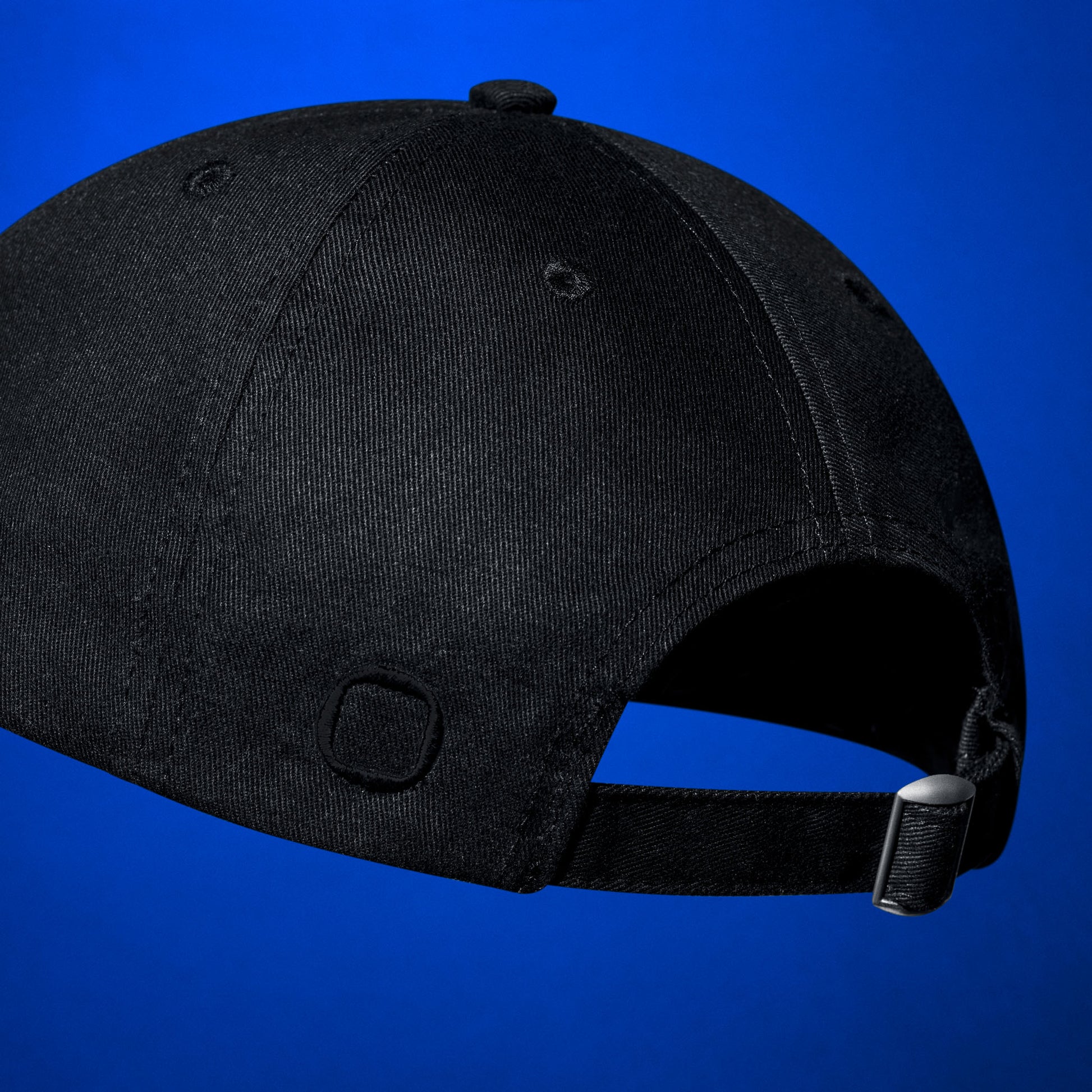 A classic black six panel cap in the beloved shape you may know as “dad hat”.